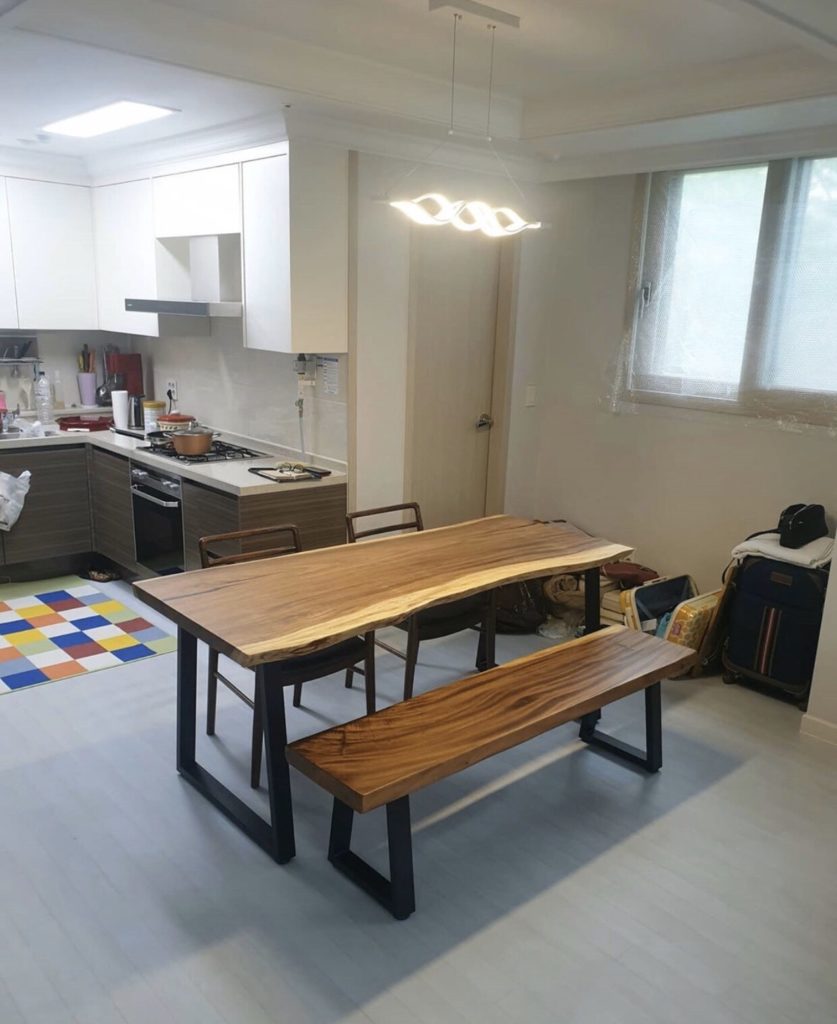 Bàn ăn gỗ tự nhiên me tây nguyên tấm có thể kết hợp với nhiều loại chân bàn và ghế khác nhau cho phù hợp với sở thích của gia chủ.
