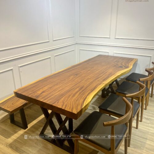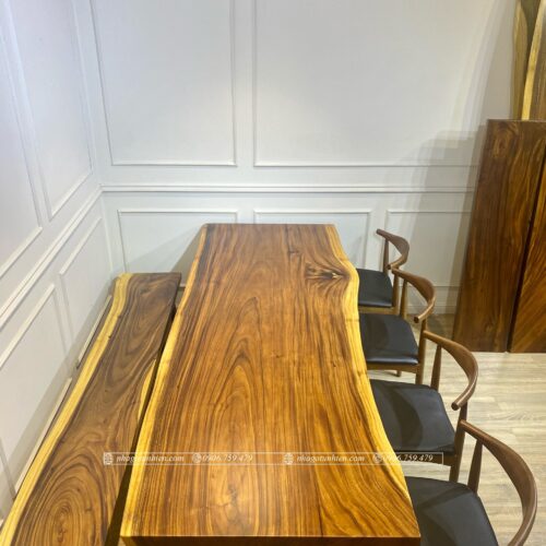 Ưu Điểm: Vân gỗ đẹp nhất trong các loại gỗ tự nhiên, mỗi bàn có một vẻ đẹp tự nhiên khác nhau không đụng hàng, mặt bàn nguyên tấm áp dụng công nghệ xấy hoàn thiện chống mối mọt, không bị cong vênh theo thời gian, dễ lau chùi, chống nước cực tốt, càng dùng càng đẹp giá trị tăng theo thời gian.